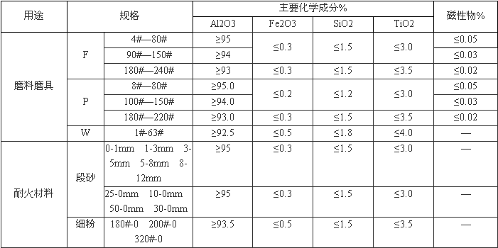 產品粒度按國際標準以及各國標準生產,可按用戶要求粒度進行加工。通用粒度號為 F4~F320,其化學成份視粒度大小而不同。突出的特點是晶體尺寸小耐沖擊,因用自磨機加工破碎,顆粒多為球狀顆粒,具有純度高,質地致密,堆積密度大,自銳性強,韌性好,磁性物含量特低的特點,用其制成的磨具磨削鋒利,發熱率低,磨削比高,且使用時沾附少;制成的燒結磨具具有燒成后顏色深藍、不起網狀裂紋、無銹斑的特點,適用于制造陶瓷、樹脂高固結磨具以及研磨、拋光等。
